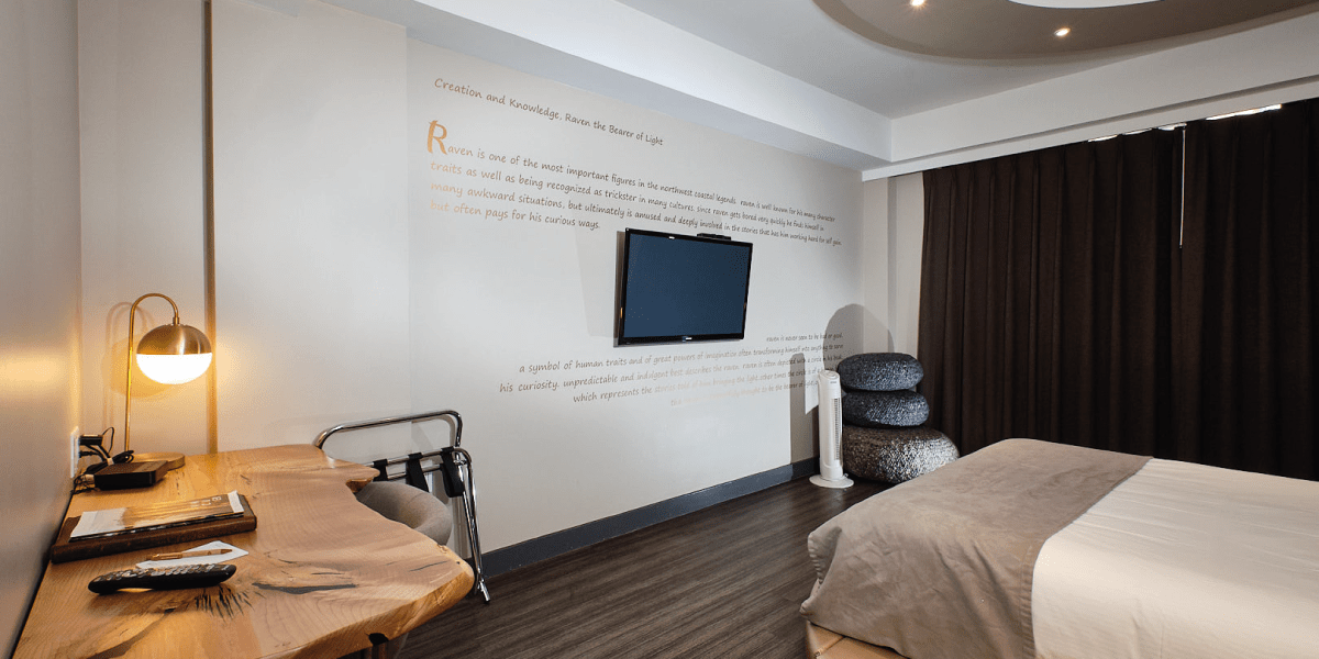 The soft colour palette also complements the room’s striking gold accents: the moon motif and Raven’s story lettered on the feature wall. A delicate yet commanding colour, gold is used to direct guests’ attention to the artistic accents that identify the inspiration behind the suite without overwhelming the overall design. Altogether the Moon Room is an ethereal space that commemorates this traditional tale.
